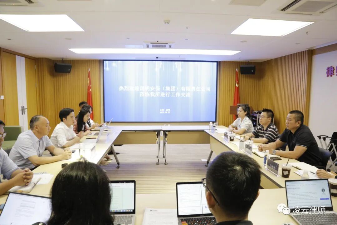 昆明安保(集团)有限责任公司(以下简称“安保集团”)董事长段波等一行五人于8月22日下午莅临云南凌云律师事务所,与我所耿国平、杨杰等律师就企业法律顾问业务进行沟通交流。
